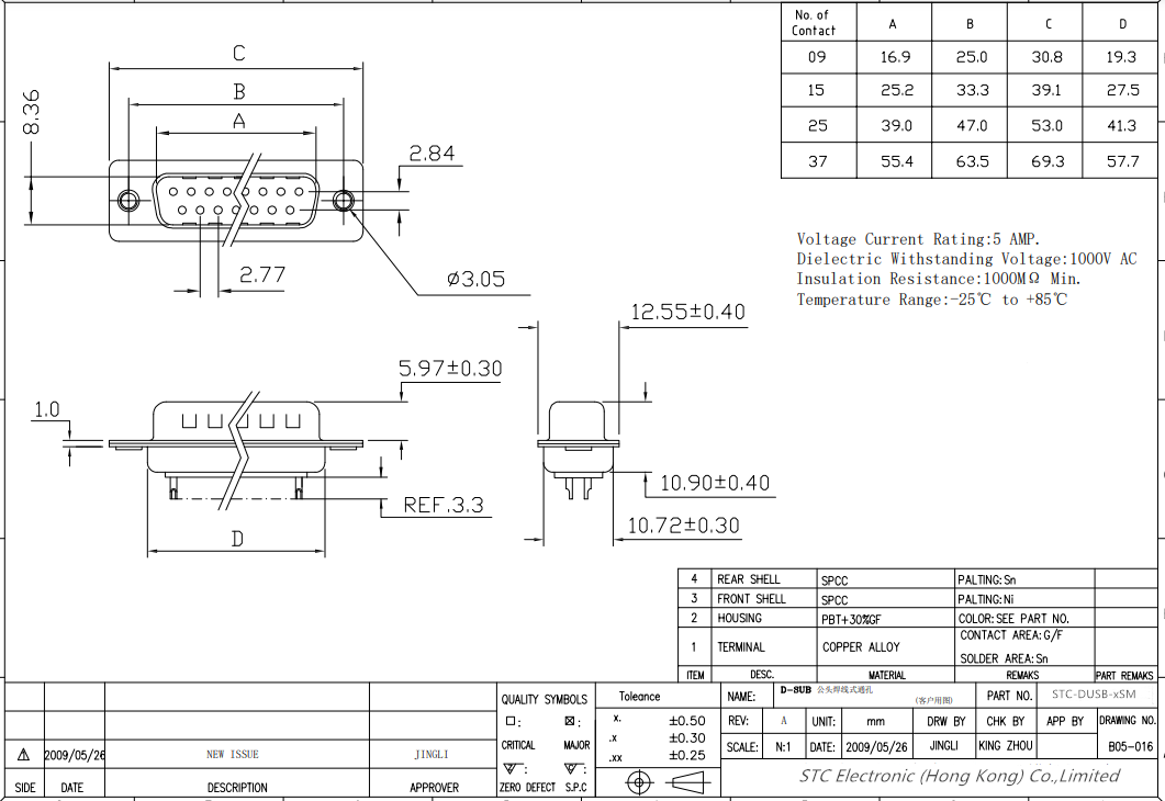 b) Dielectric WithstandingVoltage: 1000V AC c) Insulation Resistance: 1000MΩ/Min d) Contact Resistance: 30mΩ/Max e) Operaion Temperature: -20℃~+85℃ |