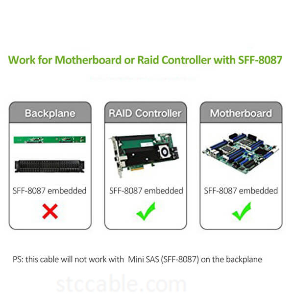 Important Notes: Do NOT Work with a Backplane with Mini SAS (SFF-8087). Please make sure it's Mini SAS port (SFF-8087) on your motherboard or RAID Controller.