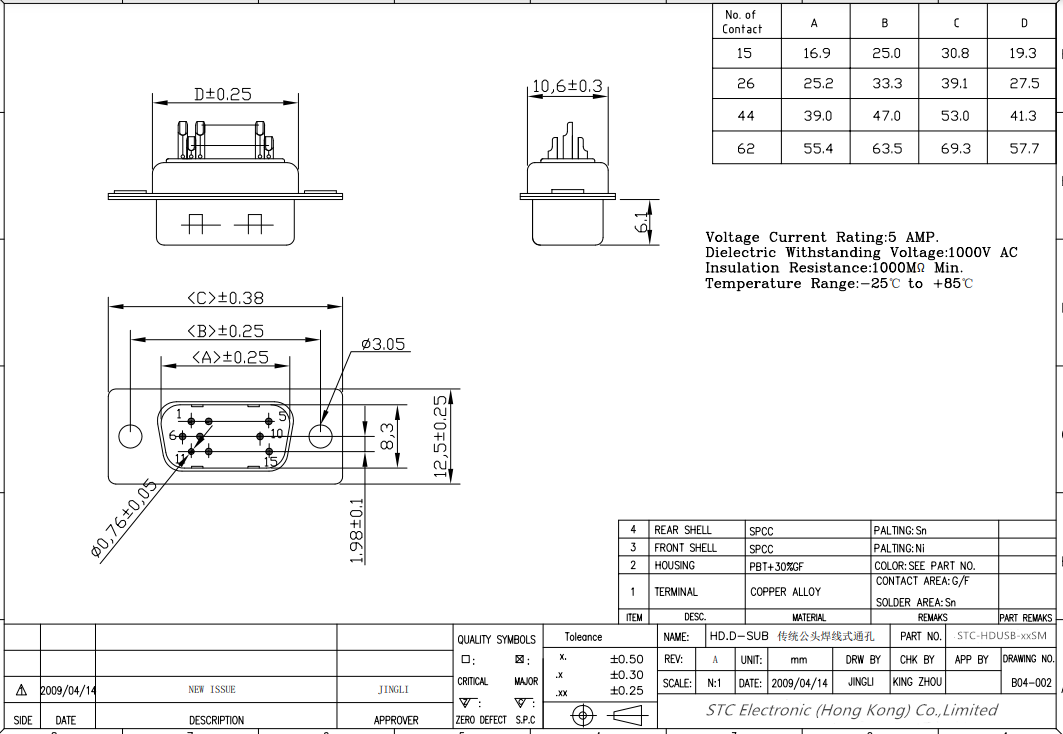 HD-SUB HDB 15 Pin 26 Pin 44 Pin 62 Pin male Connector Solder Type For cable assembly.