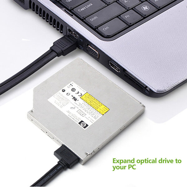 eSATAp to Slim Sata adapter cableThis shielded Power Esata eSATAp to Slim Sata 7+6 13Pin Cable offers ahigh quality 1.8 inches connection between a desktop or laptop computer and external SATA storage devices, allowing you to “externalize” the impressive capabilities offered by Serial ATA.This eSATAp (Power over eSATA) to Slim SATA 13pin enables you to connect your DVD drive with Slim SATA interface to a free Power Over eSATA (eSATAp) port. The eSATAp port combines eSATA and USB and enables the power supply via the integrated USB interface.