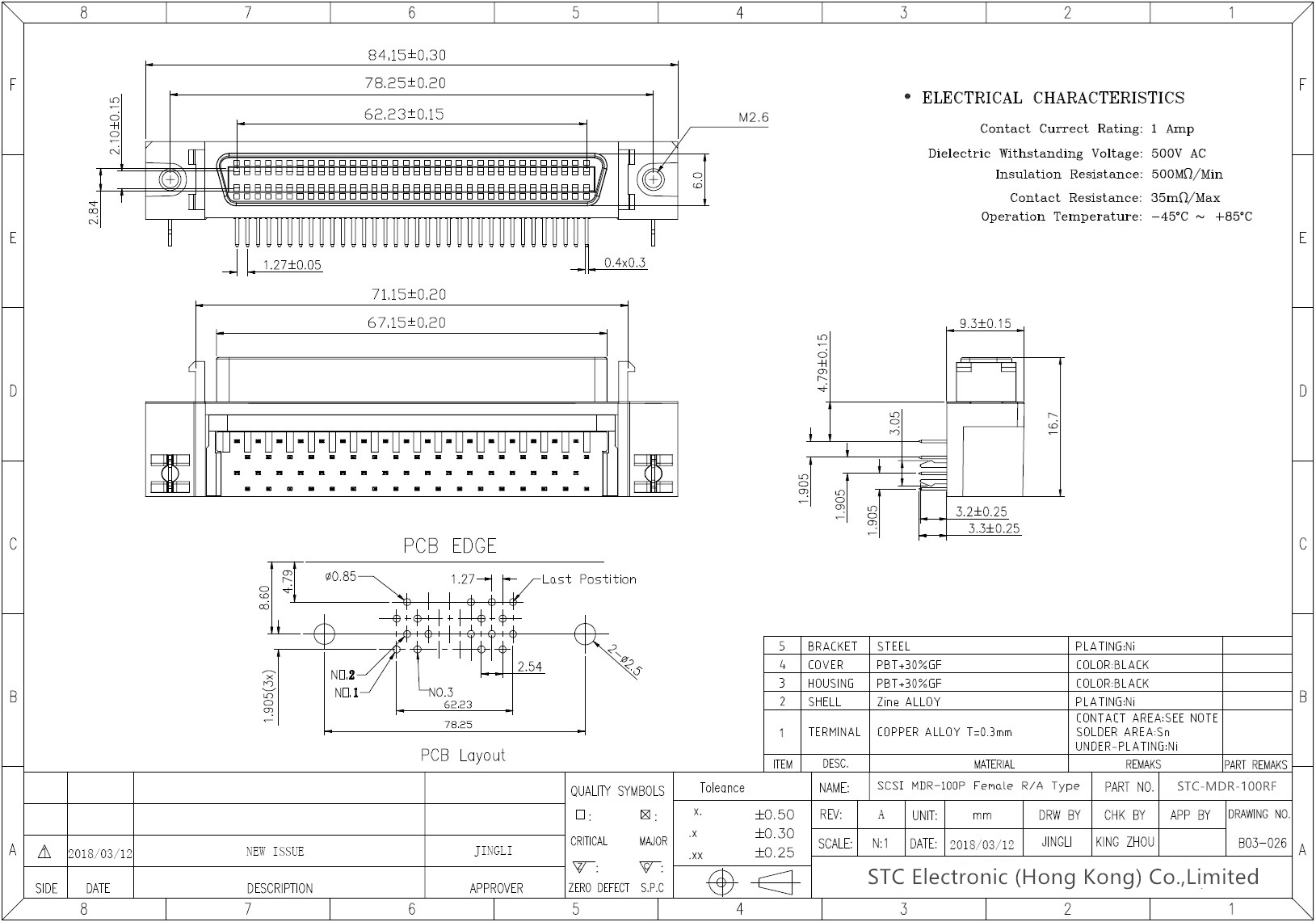 HPCN SCSI 100 Pin female connector pitch=1.27mm 90 degree right angle dip Type, HPCN MDR 100 Pin female connector for PCB.