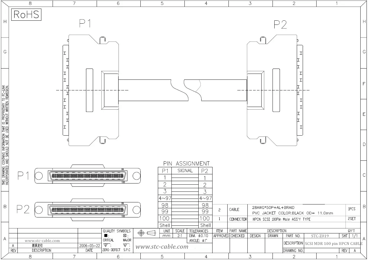 - MDR 100 pin male to male HPCN SCSI cable with Metal shell.