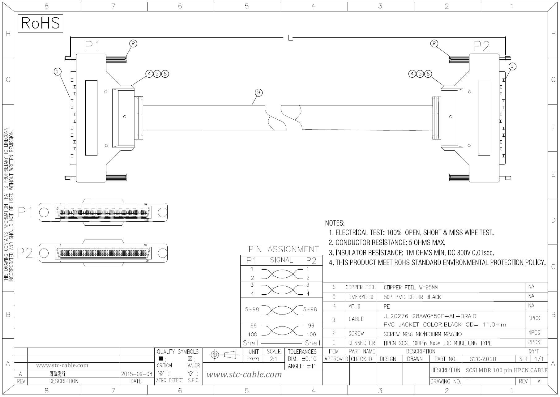 - MDR 100 pin male to male HPCN SCSI cable with PVC Overmolded and screws.