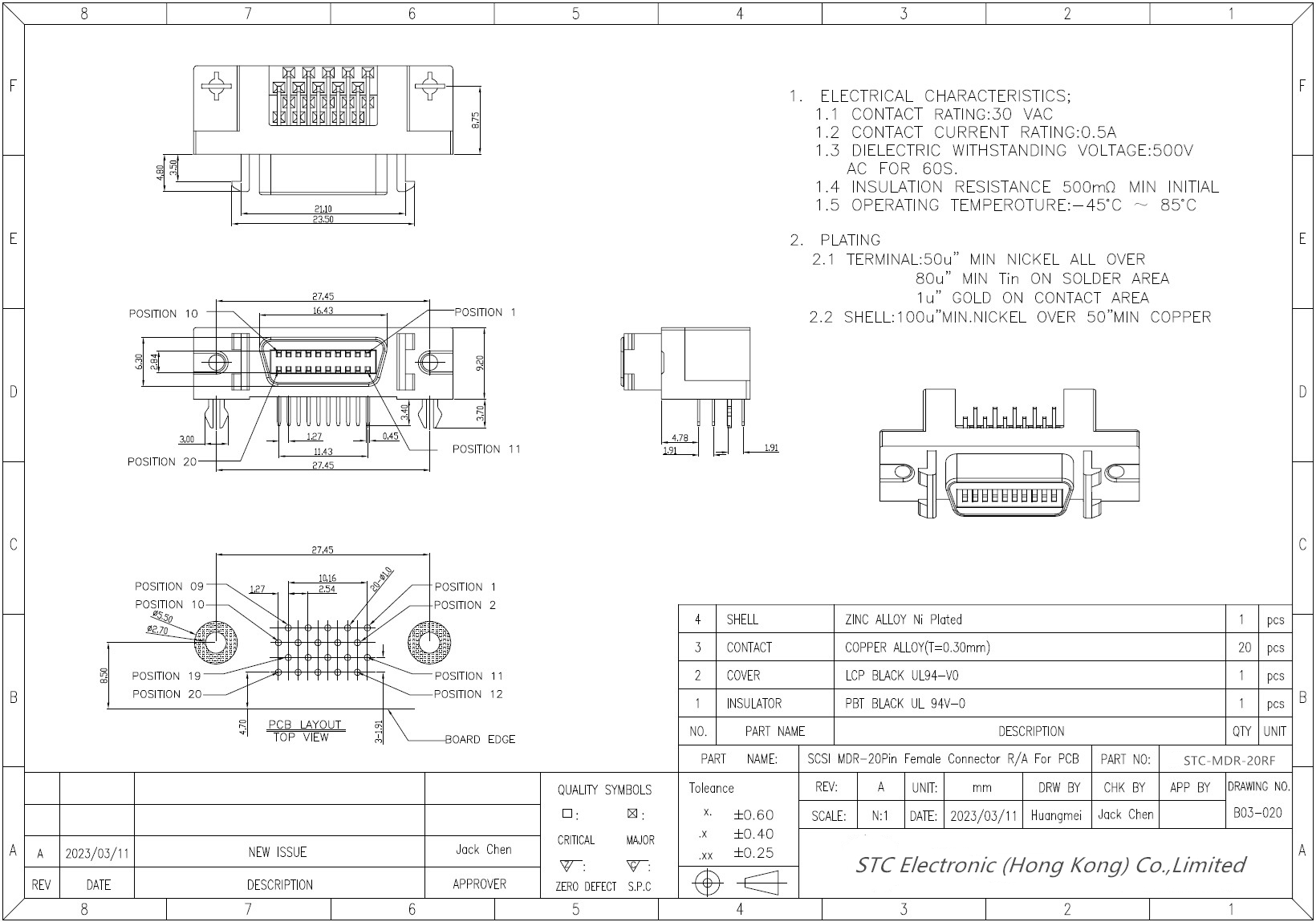 HPCN SCSI 20 Pin female connector pitch=1.27mm 90 degree right angle dip Type, HPCN MDR 20 Pin female connector for PCB.