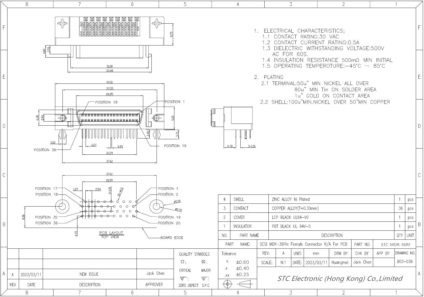 HPCN SCSI 36 Pin female connector pitch=1.27mm 90 degree right angle dip Type, HPCN MDR 36 Pin female connector for PCB.