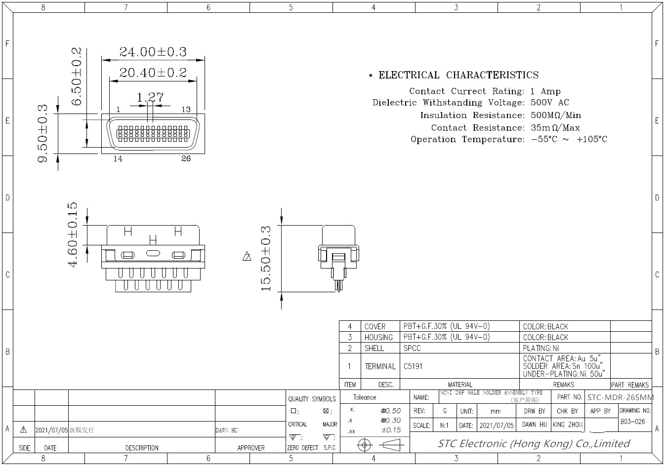 MDR 26 Pin Male connector pitch=1.27mm Solder Type With Metal Hood, MDR male 26 pin solder connection