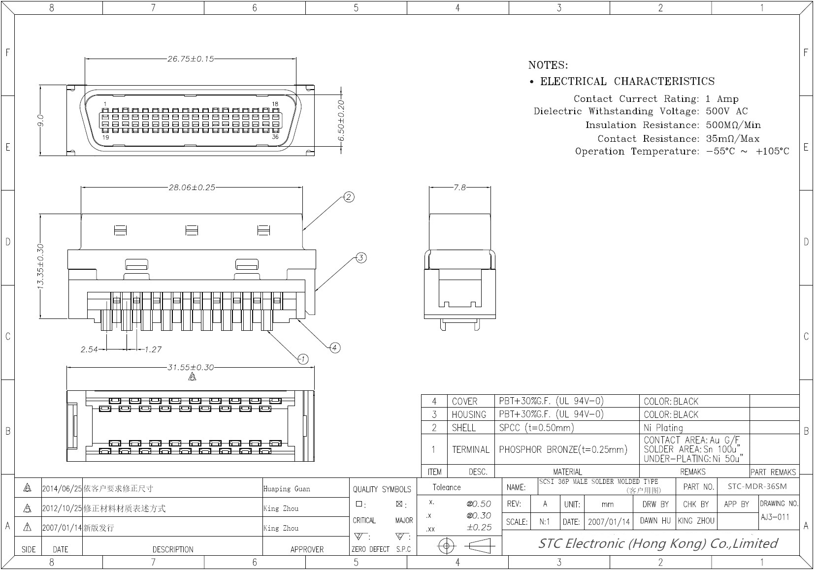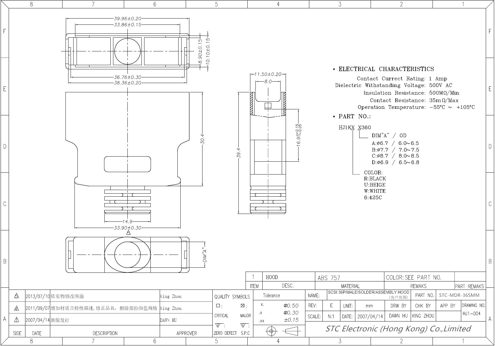 MDR 36 Pin Male connector with ABS Hood pitch=1.27mm Solder Type, MDR male 36 pin solder connection