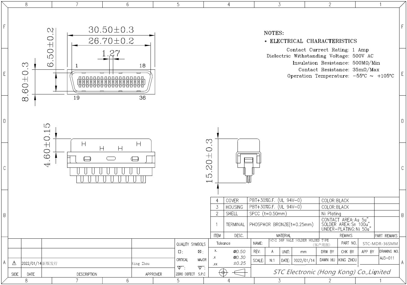MDR 36 Pin Male connector pitch=1.27mm Solder Type With Metal Hood, MDR male 36 pin solder connection