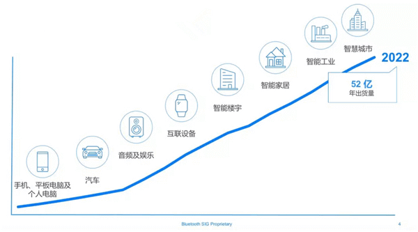 At present, Bluetooth technology is used in applications such as smart phones, tablets, automobiles, audio entertainment devices, smart homes, smart buildings, and smart industries. According to ABI Research's report, shipments of Bluetooth products in 2008 were 4 billion, and it is expected to grow to 5.2 billion by 2022.