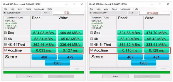 The performance of SSDs is related to many factors, and space usage can also affect the speed of SSDs. After 80% full disk usage, the access time of the Toshiba TR200 increased from 0.033ms to 0.115ms. The access time is the delay in reading and writing data in the smallest access unit, and is tested in 512 bytes in the AS SSD Benchmark.
