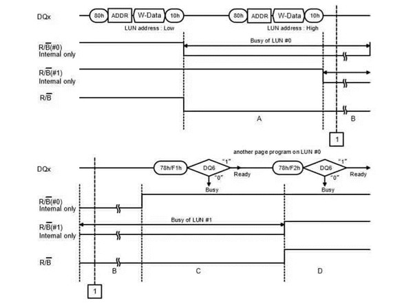 The following figure is a schematic diagram of interleaved write: A-stage LUN0 is performing page programming write, and LUN1 is in Ready idle ready state. Before LUN0 write is not completed, the master can issue other write instructions to LUN1. Both phase LUN0 and LUN1 are performing write operations. The write command for the LUN0 in phase C has been executed, and the idle ready state is restored, and LUN1 is still executing the write command. Both phase LUN0 and LUN1 have completed the write command, and all of them enter Ready idle ready.