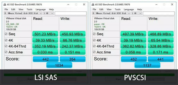 By comparison, it is not difficult to see that the biggest advantage of PVSCSI mode is that single-threaded QD32 random read/write can exceed 100,000 IOPS, while 8-thread*QD8 has little difference in performance from traditional LSI Logic SAS, and can reach 100,000 IOPS.