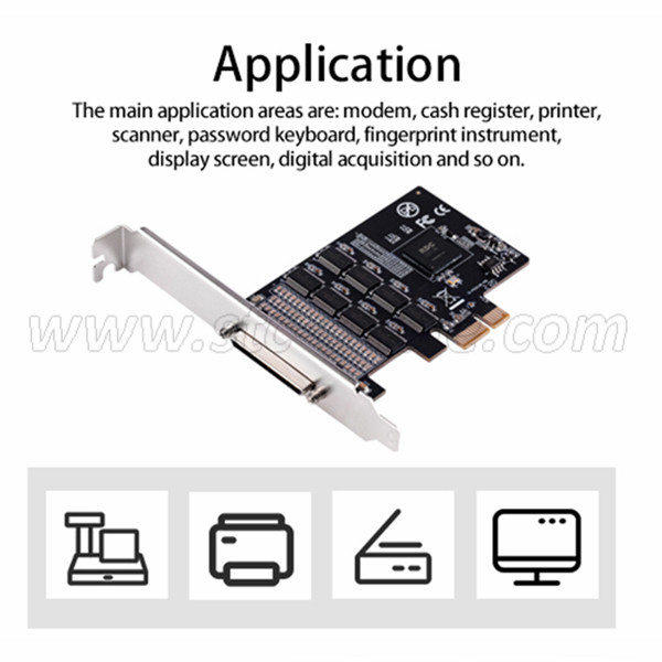 Industrial-grade PCIE multi-serial card has a wide range of applications. The main application areas are: modems, cash registers, printers, scanners, password keyboards, fingerprint scanners, display screens, digital collection, etc.