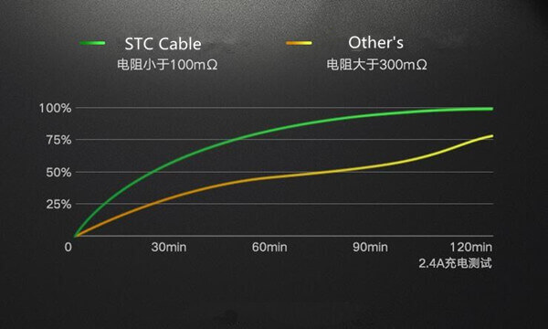 Actual comparison test: Charge the HUAWEI P20 through the STC MFi certified data line, compare the other non-MFi data on the market to charge the HUAWEI P20, and increase the charging efficiency of the STC data line by more than 25%.
