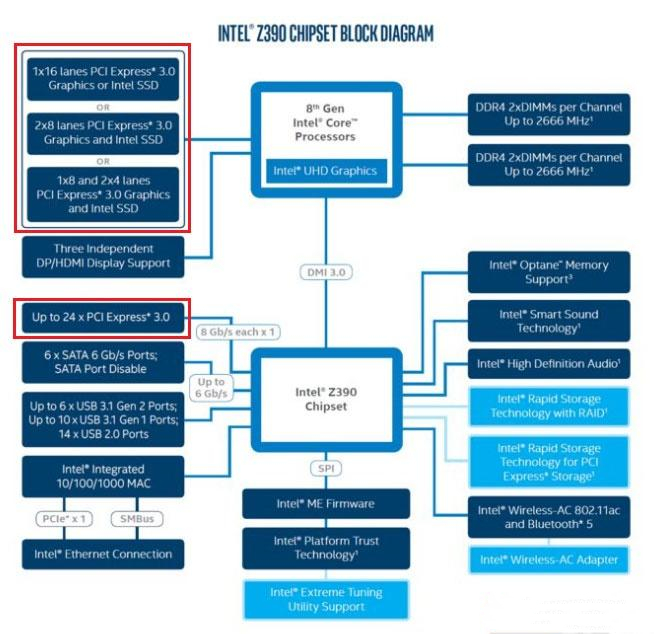 The picture above shows the structure of the new motherboard. In this motherboard, the Northbridge is fully integrated into the CPU, so there are only two main parts: the CPU and the Southbridge (hub or platform controller hub). Likewise, the graphics card and memory are connected directly to the CPU. But there are two points you should pay attention to: a. The graphics card is connected to the CPU through the PCIe bus; b. The motherboard supports a direct connection between the CPU and PCIe SSD. The chipset (Southbridge) is then connected to the CPU via the DMI (Direct Media Interface) 3.0 bus based on the PCIe bus. The Southbridge distributes 24 PCIe lanes for connecting hard drives, USB devices, network cards, sound cards, and more. It can be said that PCIe is more than just a local bus. It is already the system bus.