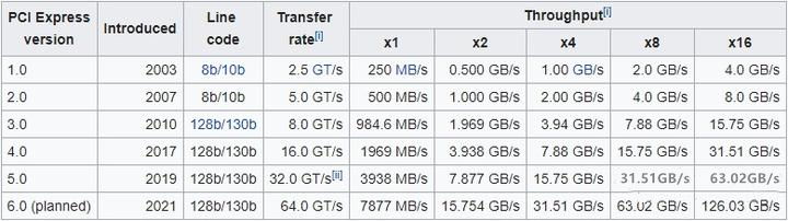 32-bit PCI speed is 133 MB/s, while 64-bit PCI speed is 266 MB/s. As for PCIe speed, it varies by channel and version, as shown in the table below: