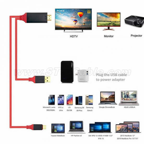 USB Type C to HDMI MHL AdapterUSB Type C to HDMI 4K HDTV Video Cable MHL Adapter 2 in 1 function, supports both HDMI connecting and charging, Plug and play ready, easy set up, 6 feet of length long enough for most, upport 4K*2K ultra HD resolution up to 3840x2160@30 Hz, and backwards compatible to 1080P, 720P usage needs, ompatible for Samsung Galaxy Note 8/S8/S8+/A7 2017, LG G6/G5/LG V20, HTC 10/U Ultra, MicroSoft Lumia 950/950XL, Huawei P9 P9 Plus P10 Plus. Features: 1. USB3.1 to HDMI converter, which allow you to connect your phone to HDTV, up to 4K*2K resolution. 2. Perfect for playing back your HD videos Movies, photo albums on a HDTV via this smart HDMI cable.