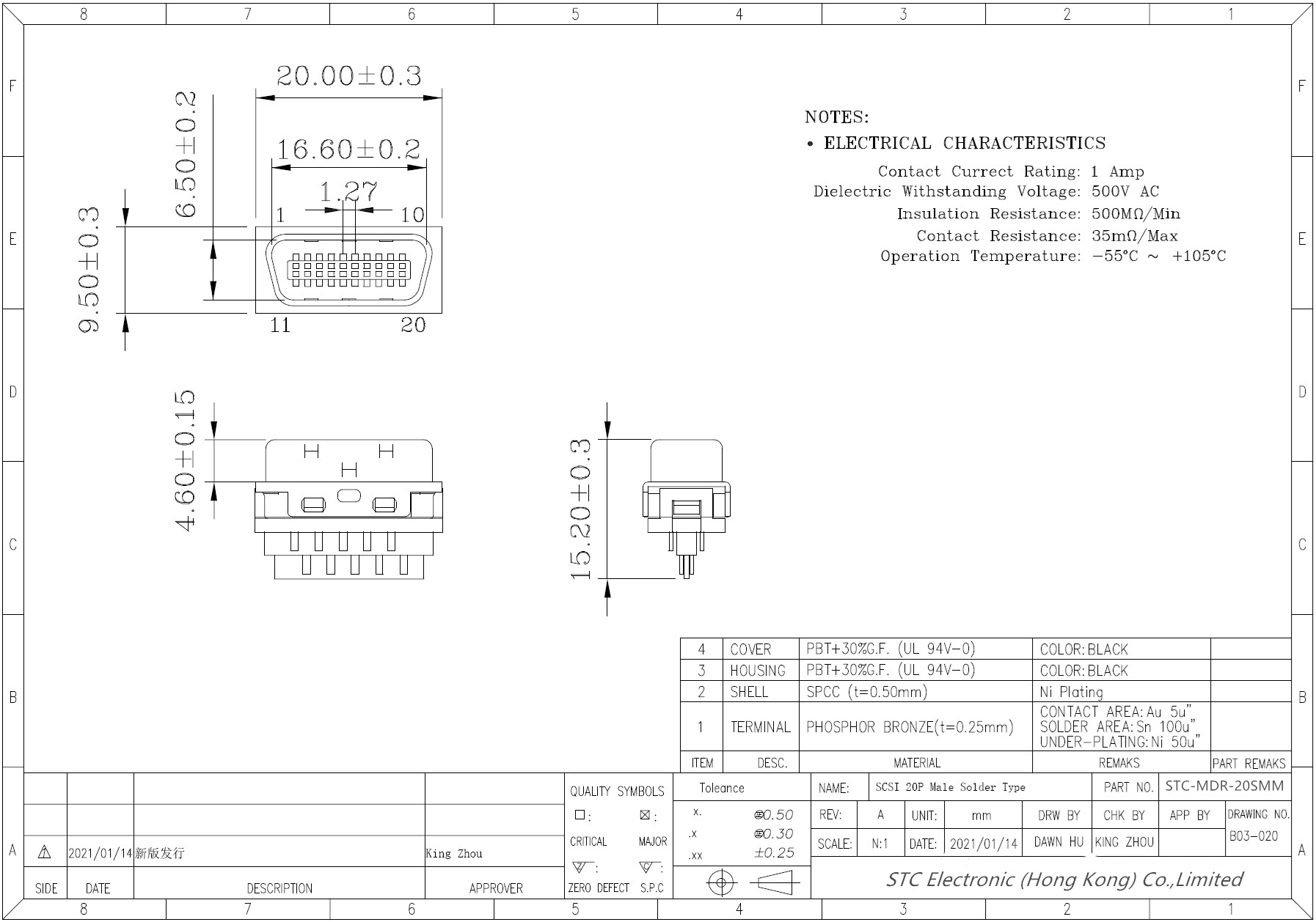 MDR 20Pin Male connector pitch=1.27mm Solder Type With Metal Hood, MDR male 20 pin solder connection