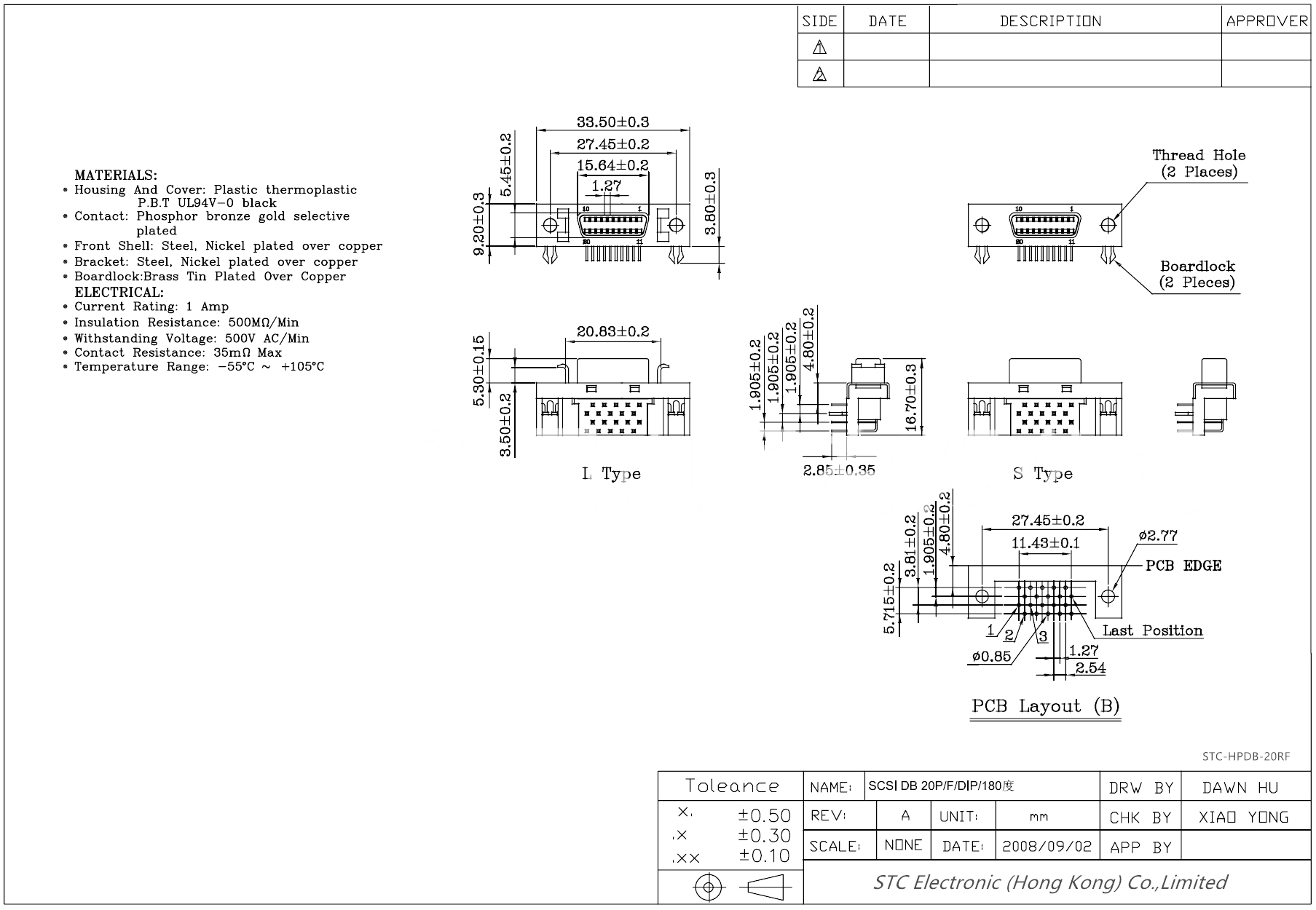 HPDB SCSI 20 Pin female connector pitch=1.27mm 90 degree right angle dip Type, HPDB SCSI-2 20 Pin female connector for PCB.
