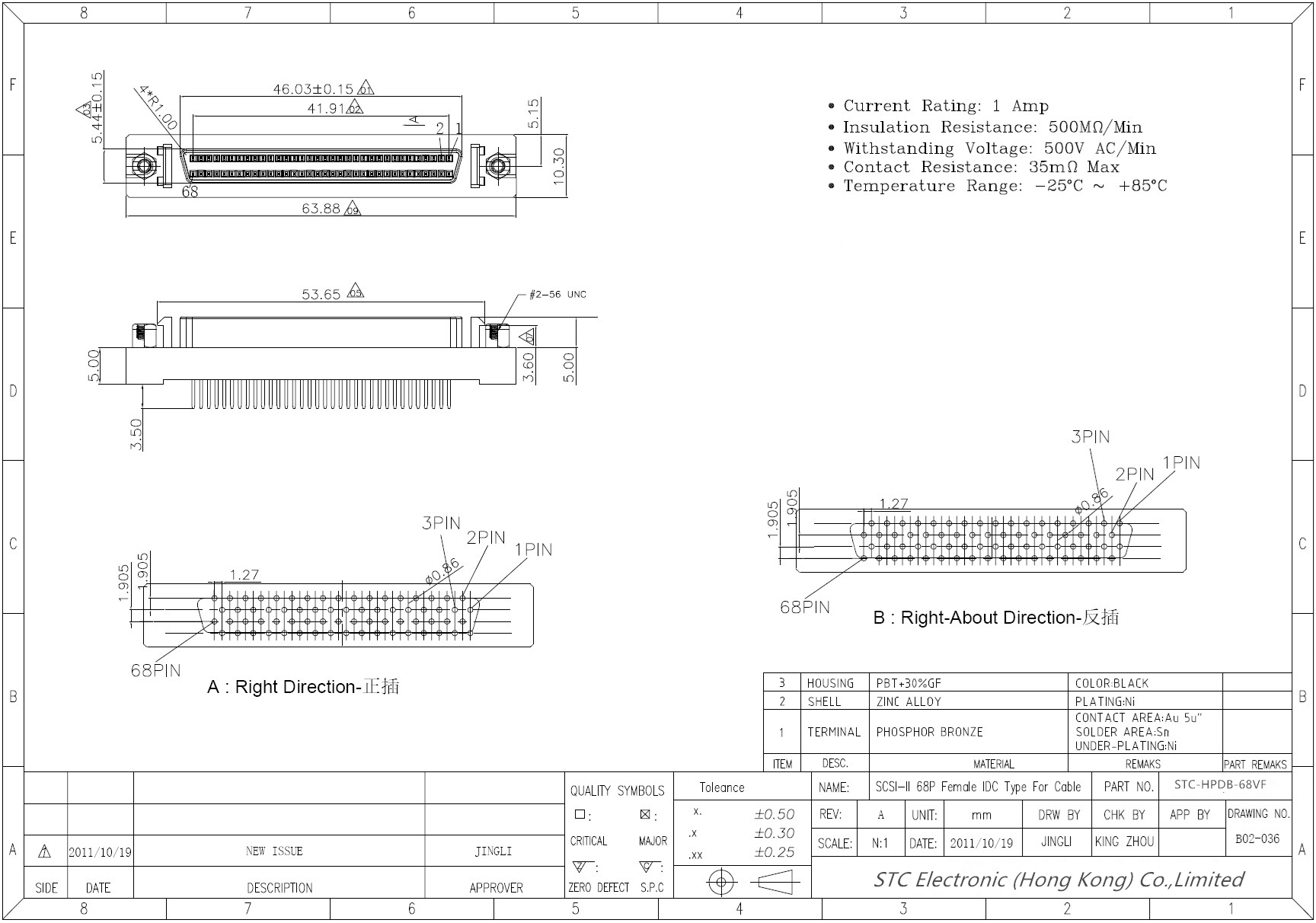 HPDB SCSI 68 Pin female connector pitch=1.27mm 180 degree Vertical dip Type, HPDB SCSI-2 68 Pin female connector for PCB.