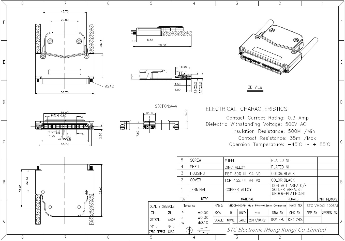 VHDCI 100 Pin Male Connector Pitch=0.8mm With Metal Hoodector.