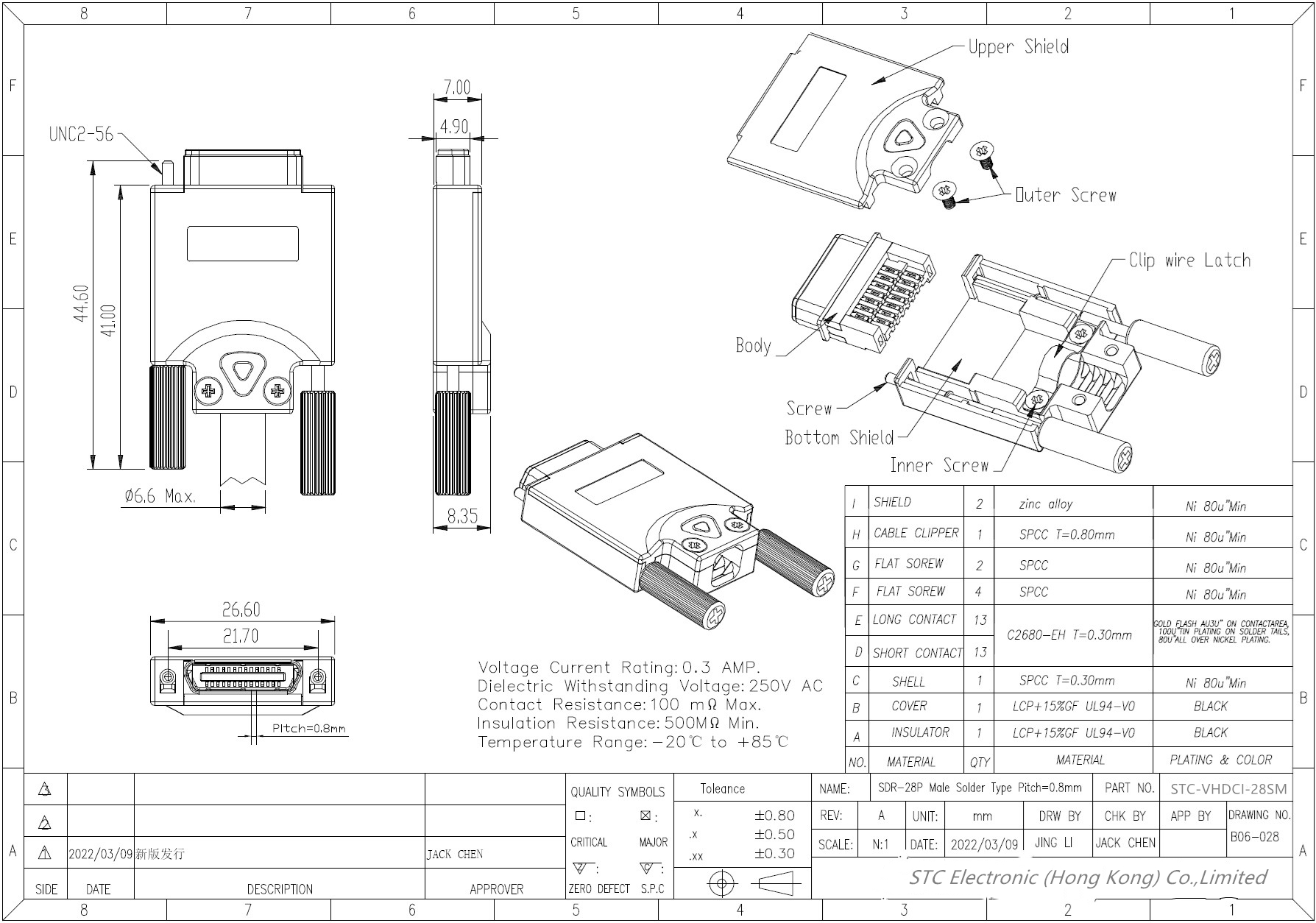 VHDCI 28 Pin Male Connector Pitch=0.8mm With Metal Hoodector.